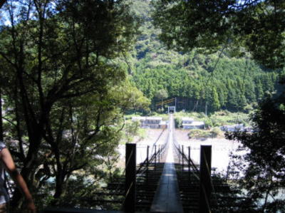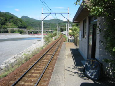 家山からは大井川の右岸を走ると車も少なく、七曲がりの景色も最高でした。 九野脇キャンプ場から吊り橋を渡って左岸の塩郷駅(無人)へ。