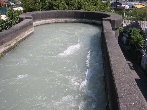 県道をはずれて堤防沿いを走ると大井川用水が大井川の上を通っていて自転車で金谷側へ渡る事が出来ます。通路の下には菊川方面への大量の水が流れていて、ここへ落ちたら・・コワ!