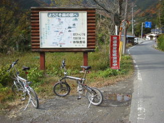 やっと、山を越え・・掛川市の山奥に 到着。・・・ちょっとBD−1を休め休憩 観光案内の看板を見ると、キャンプ場 とか・・・面白そうな所が・・やはり行く しかないか、ちょっと、先の山奥くまで |
