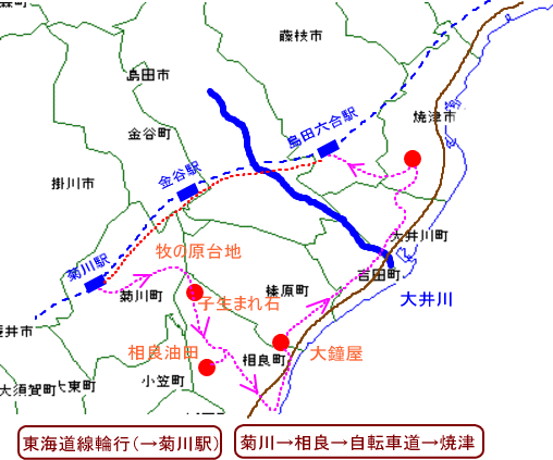 | ■ 焼津市→(BD-1)→島田六合駅→(輪行)→菊川駅(BD-1)→牧の原→相良→子生まれ石・相良油田・大鐘屋→榛原町→(自転車道)→吉田町→大井川町→焼津市 ■ |