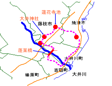 | ■ 焼津市→(BD-1)→藤枝(蓮花寺池)→島田(大井神社)→島田宿→大井川蓬莱橋 →150号線→焼津市 ■ |