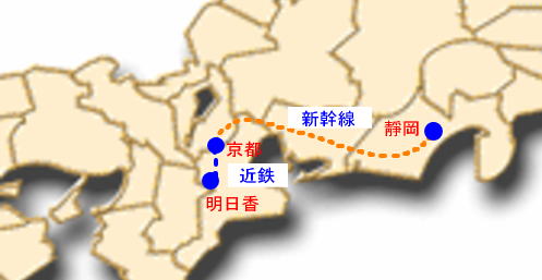 | ■ 焼津市→車→靜岡駅→新幹線(輪行)→京都駅→近鉄(輪行)→橿原神宮前→明日香ポタリング→民宿宿泊→橿原神宮前→(輪行)→近鉄(輪行)→京都駅→新幹線(輪行)→静岡駅→車→焼津市 ■ |