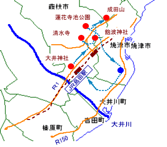 | 【コース】 出発朝8時>>>帰宅14時30分 走行は約45kmです。 ●焼津自宅→BD-1→島田大井神社→藤枝清水寺→藤枝飽波神社→藤枝成田山→蓮華寺池公園→帰宅● |