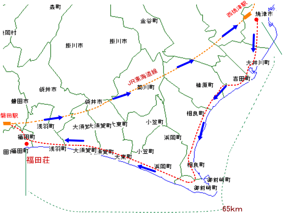 | 【コース】 出発朝11時>>>福田町18時00分 走行は約65km>>翌日、帰宅走行80km ●焼津自宅→大井川太平橋→吉田町→150号線→福田町→(一泊)→磐田駅→輪行→西焼津駅→帰宅● |