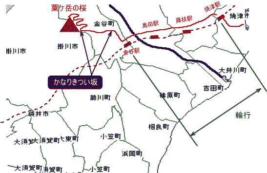 | 【コース】 出発朝07:45時>>>帰宅17時 走行は約40km ●自宅→輪行→JR金谷駅→粟ケ岳の花見→JR金谷駅→→輪行→自宅● |
