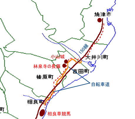 | 【コース】 出発朝09:45時>>>帰宅16時30分 走行は約47km ●自宅→150号線→吉田町(自転車道)+林泉寺の長藤→榛原町→ 相良町(自転車道)→海岸の草競馬●・・・・の往復 |