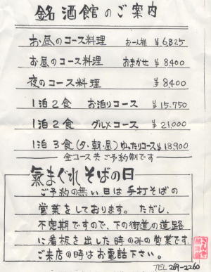 ★ コンヤ温泉「銘酒館」のご案内★ 24時間入浴可能な温泉は自然に触れながら 落ち着いた露天風呂付き。 露天風呂には(^.^) 酒飲みには。。たまらない 生ビールサーバー完備で・・飲み放題!! 温泉は。。ちょっとぬるっとした。。肌に良さそうな。 食事はガラス張りの板張りの広間で・・これが情 緒ある雰囲気で・・銘柄豊富な・・日本酒・焼酎が 楽しめます。また、料理も格別、上の写真はガラス 越しに外で焼いているステーキ(^.^) その他、山の幸を生かした食材は満足の一言!! 一泊2食で・・15,750円はちょっと高いと思われるが 値段以上の満足感はあると思います。 ←左のMENUはクリックでアップします |