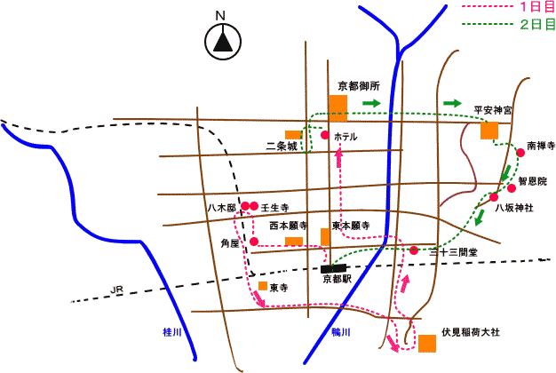 | 【コース】 出発 13日(月)午前8時自宅>>(輪行)>>京都探索-ホテル-14日(火)京都探索 >>(輪行)>> 帰宅 14日(火)午後6時 走行は約48km ●13日(月)焼津自宅8時→(輪行:JR東海道線→静岡→新幹線→京都駅)10時50分→西本願寺→角屋→新選組発祥地「八木邸」「壬生寺」→東寺→伏見稲荷大社→ホテル一泊→14日(火)二条城→平安神宮→南禅寺→智恩院→八坂神社→三十三間堂→京都駅→(輪行)→焼津自宅18時着● |