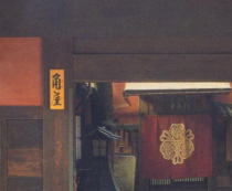 ![]() 芹沢鴨が暗殺された時に つけたと言われる鴨居に 残る刀キズ。 |