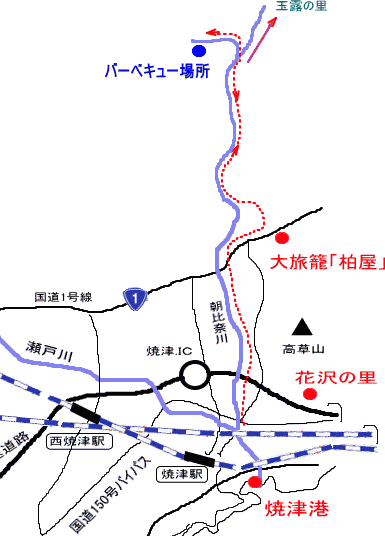 | 【コース】 ●出発 焼津自宅 午前10時→朝比奈川自転車道→上流川原でバーベキュー→帰宅 午後4時● 走行は約40km |