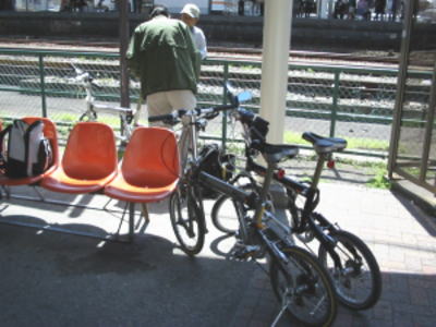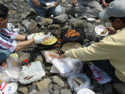 | 朝比奈川上流の手ごろな場所を見つけ、準備。。材料は、岡部町のマーケットで調達、鉄板はyosiさんが、フライパンはikurouさんがと5人が分担してリックで運ぶ。自転車一人でバーベキューなど無理ですが5人集まれば自転車でこんなことも出来ます。 やはりアウトドアで食べる食事、ビールは最高ですね!・・と、手馴れた手つきで手際よく準備するikurouさんはさすがアウトドア派 (^^♪ |
