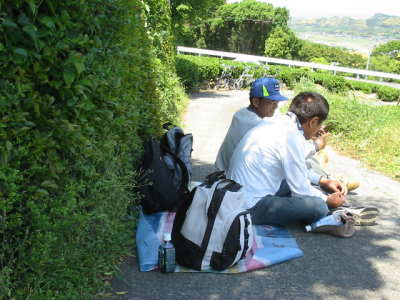 やっと牧の原台地に登り休憩中のSUZUKIさんとYOSIさん | |