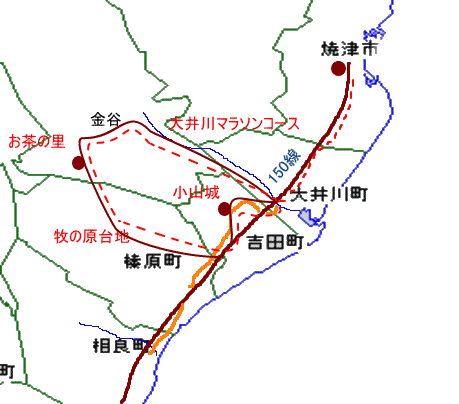 | 【コース】 ●出発 焼津自宅 →吉田町の小山城→牧之原台地(お茶の里)→金谷→大井川マラソンコース → 帰宅● 走行は約48km |