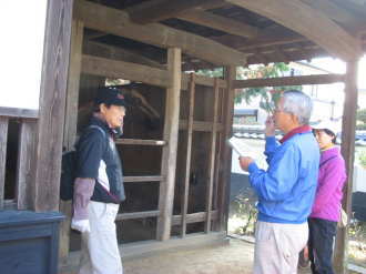 ![]() 「うまや」で説明を聞くH氏ご夫婦 |