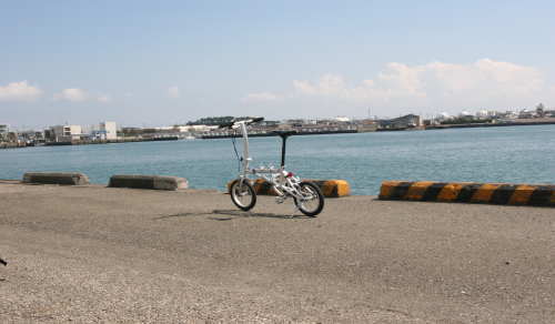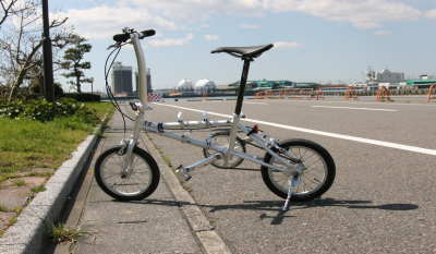 《走行インプレッション》 折りたたみ自転車を愛用している方には、あまり違和感は無いと思いますがロードバイク、マウンテンバイクなどから乗り換えるとスタート直後のハンドルの不安定感には驚くと思います。でも、少しスピードが増すと・・・BD−1と遜色の無い直進安定感がありました。14インチタイヤで走っていることを忘れてしまいます。 昇り坂に入り、ギアを落とせない・・覚悟して走りましたが、車体が軽い(BD−1の約半分)ことからBD−1で数段ギアダウンしたと同様の力でスイスイと昇っていきました。 走りについては、14インチタイヤを考えると期待以上の仕上がりでした。 走ってみてちょっと、気になるところは、車体が軽量であるため、車道を走ると大型車両が横を通ると風でかなりあおられることです。ちょっと危険な状況になります。できれば、歩道をゆっくりと走行した方が安全ですね! と、軽くするための超軽量サドル(重量195グラム)は、かなり堅く・・このサドルには我慢できませんでした。で、重量は重くなりますが・・さっそく、BD−1購入時に着いていたサドルと交換しました。 |
