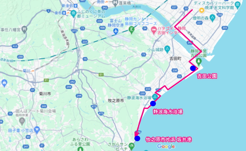 大井川の太平橋を渡り、吉田町に入り川土手を海岸に向かいました。