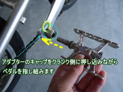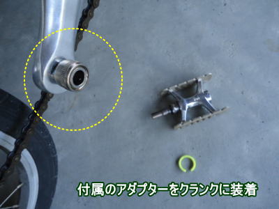 付属のアダプターをクランクに装着、ペダル本体はカンタンに手で脱着可能。