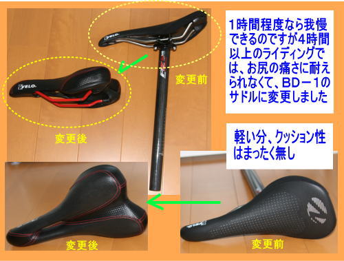 と、軽くするための超軽量サドル(重量195グラム)は、かなり堅く・・長年自転車に乗っていてお尻の皮は厚くなっていると思いましたが(笑)・・このサドルには我慢できませんでした。で、重量は重くなりますが・・さっそく、BD−1購入時に着いていたサドルと交換することとなりました。