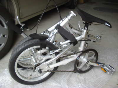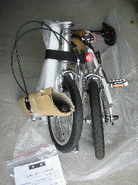 専用のキャリングバックに入れると、折りたたみ自転車特有の形の定まらないフニャフニャ状態ですが、タイヤとフレームを付属バンドで固定すれば何とか形になりました。現在持っている「ちび輪バック」でも運べるようにBD−1と同様にフレーム2箇所にワンタッチフックを取り付けました。>参考